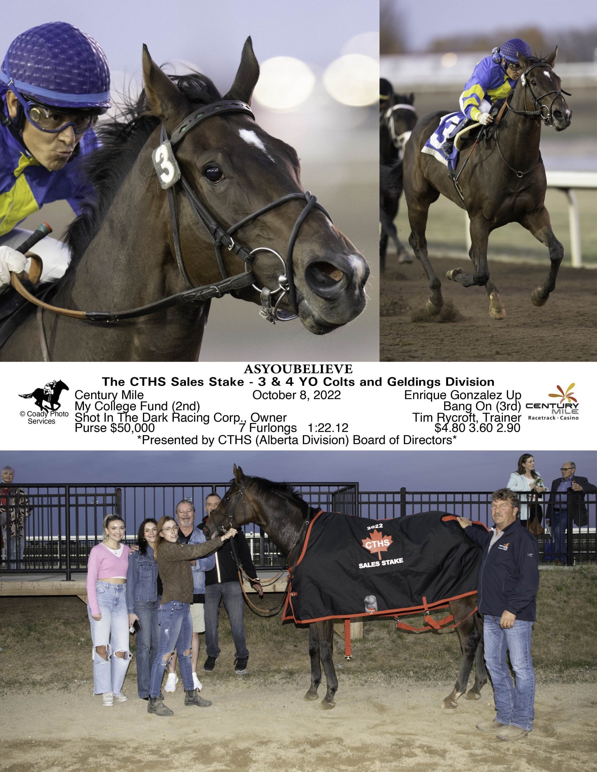 ASYOUBELIEVE was the winner of the $50,000 CTHS Alberta Sales Stake for Three and Four Year Olds. The Second in Command three year old was bred by Bennett and Caravetta and is owned by Shot in the Dark Racing Corp. The multiple stakes winner adds this win to a victory in the Western Canada Handicap earlier this season for a career record of 11-7-1-1 and $179,250 in earnings.