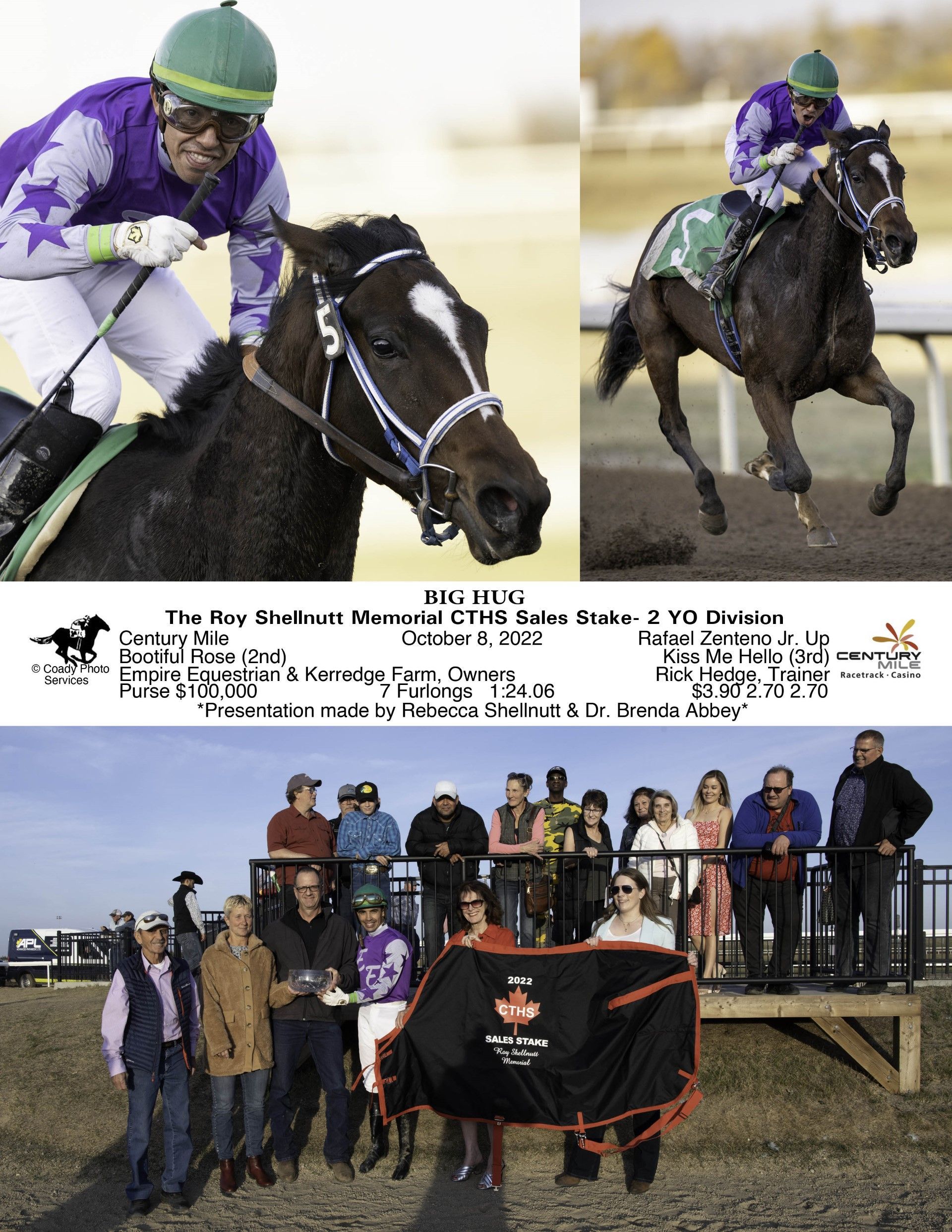 The filly BIG HUG won the $100,000 Roy Shellnutt Memorial CTHS Alberta Sales Stake for Two Year Olds. This Alberta bred has now won all four of her career starts including the Sturgeon River Stakes and the Princess Margaret Stakes. Big Hug was bred by Chalet Stable and consigned to the 2021 CTHS Alberta sale by Stone Ranches. The Mr. Big runner keeps her perfect record of 4-4-0-0 along with over $145,000 in earnings to date for owners Empire Equestrian and Kerredge Farm.