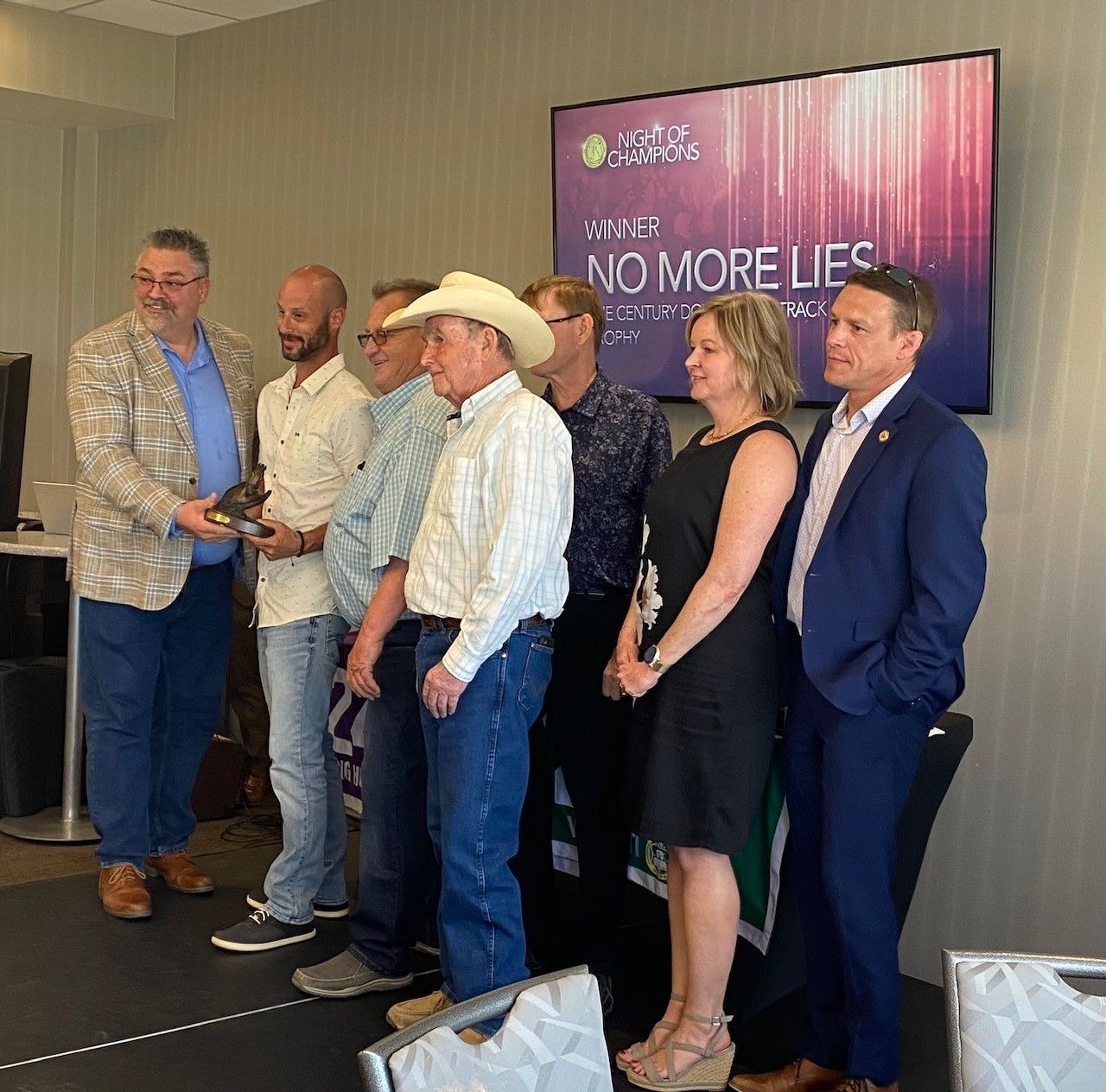 The Century Downs Racetrack and Casino Trophy for Champion Sprinter and the Dwight McLellan Memorial Trophy for Champion Two Year Old Filly were both awarded to the Alberta bred runner NO MORE LIES for her outstanding accomplishments in her debut season. The Fed Biz filly won four of her five starts including the Sturgeon River Stakes, the CTHS Alberta Sales Stakes and the Freedom of the City Stakes for earnings of $115,000. No More Lies was bred by Bushido Stables, trained by Tim Rycroft and is owned by Stetson Inc., Ryan Stetson, Stetson Enterprises Ltd. and Everblack Cattle Co.