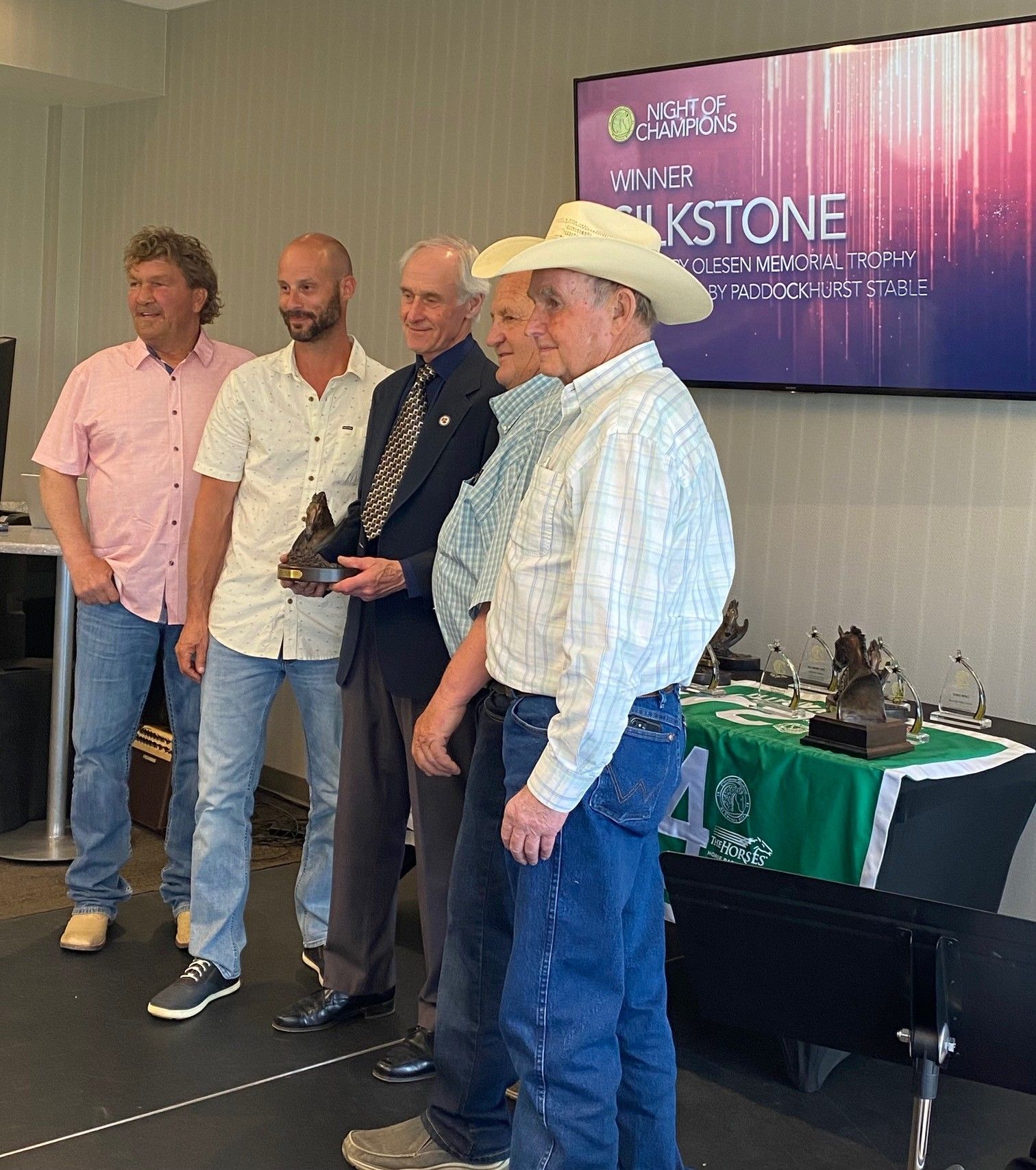SILKSTONE was named Champion Three Year Old Filly and awarded the Larry Olesen Memorial Trophy, sponsored by Paddockhurst Stables. The Ontario bred runner had three wins in six starts including the Sonoma Handicap for earnings of $67,920 last season. The Birdstone filly won three of six starts for owners Ryan Stetson, Stetson Enterprises Ltd. and Everblack Cattle Co. and trainer Tim Rycroft.