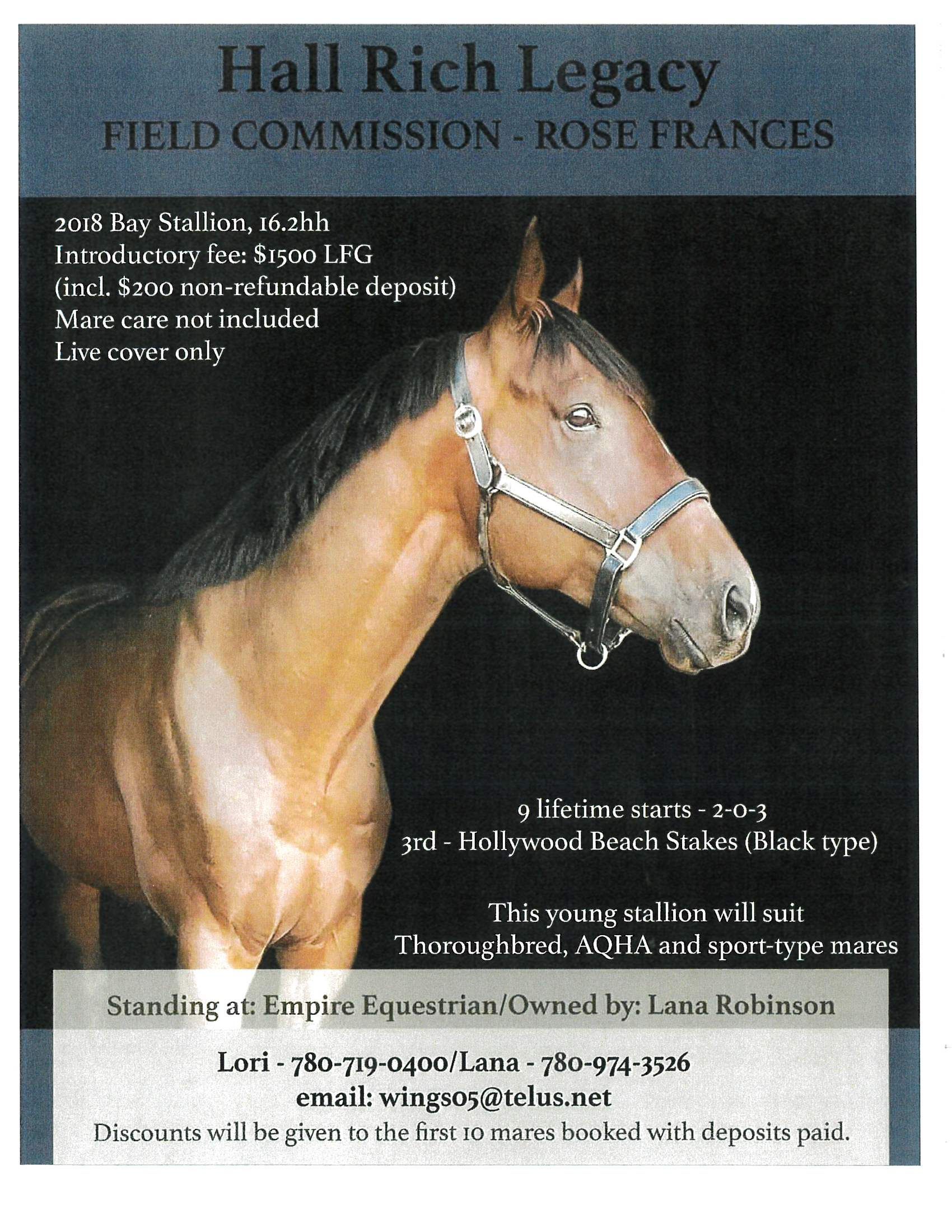 Hall Rich Legacy is a black type son of Canadian Sprint Champion Field Commission out of the black type mare Rose Frances.