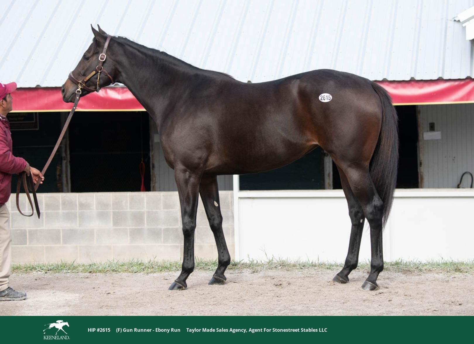 The two year old unraced filly is by Horse of the Year and black type winner of $15 Million, Gun Runner. The Candy Ride (ARG) son has sired 33 black type winners with progeny earnings of over $51 Million including G1 winners Echo Zulu ($2.64 Million) and Taiba. The dam is El Corredor daughter, Ebony Run ($85,010) who has produced 3 winners from 3 foals to race including multiple stakes placed Pickens ($384,409).