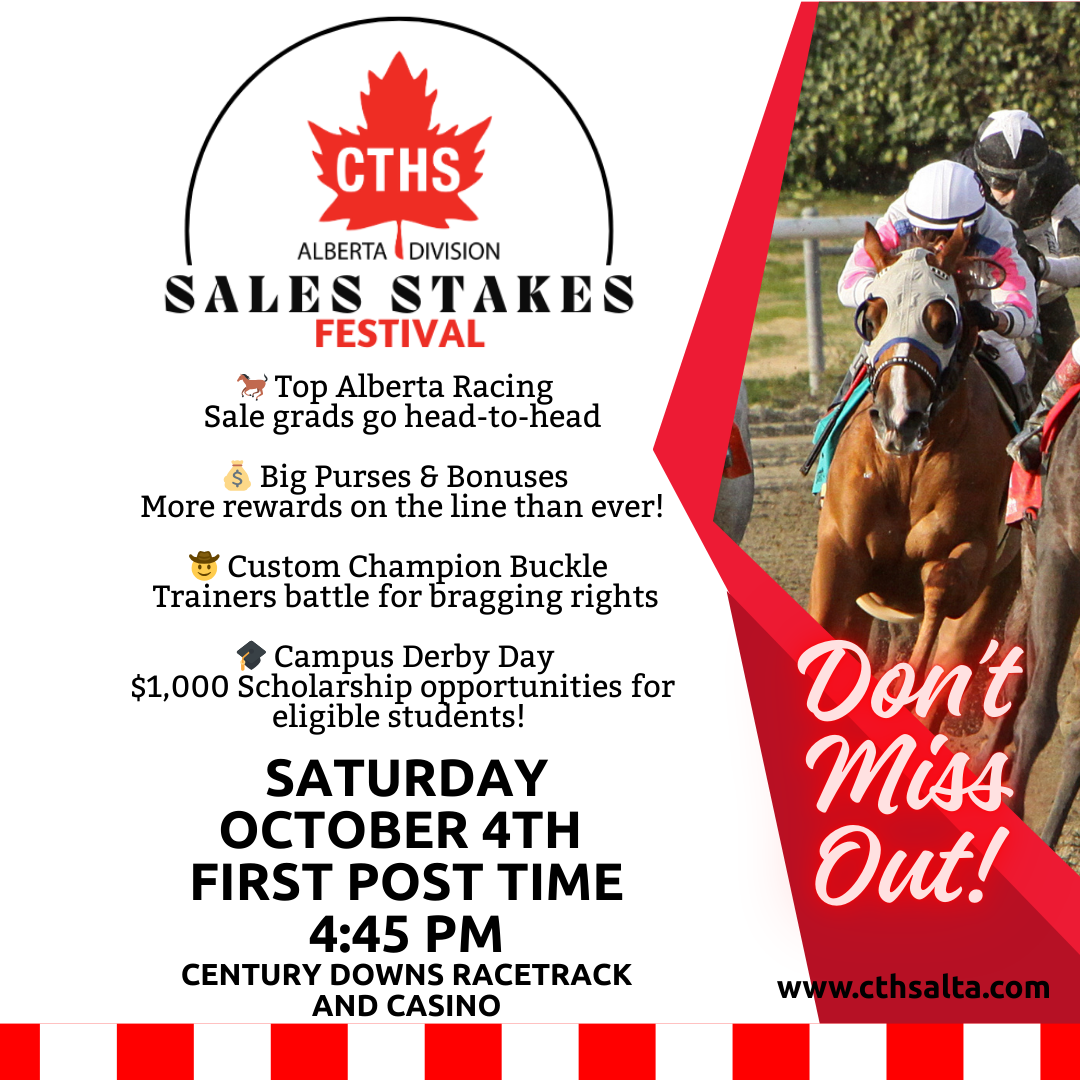 The Canadian Thoroughbred Horse Society (CTHS) – Alberta Division is excited to announce that the 2025 Sales Stakes Festival will take place on Saturday, October 4th at Century Downs Racetrack and Casino, with the first post at 4:45 PM. This annual showcase has become one of the most exciting days of the year for Alberta’s racing community, highlighting the quality and strength of CTHS Sales Stake graduates.